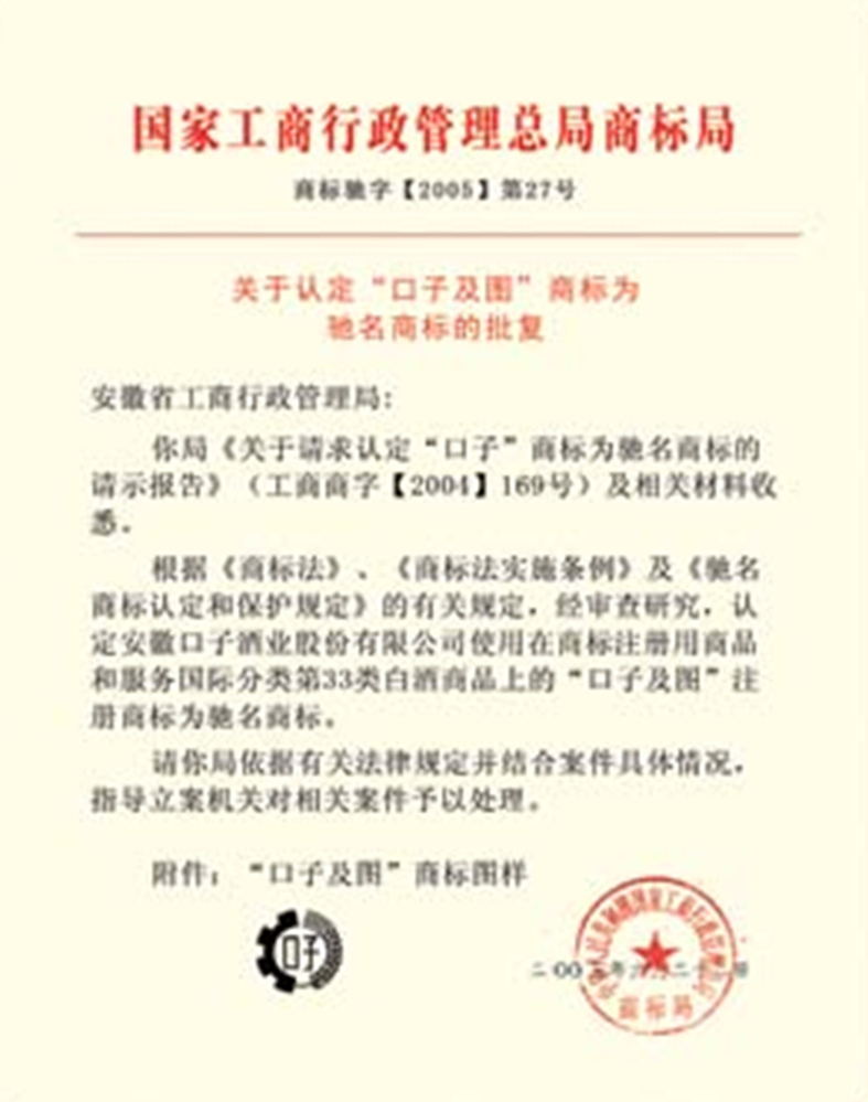 被國家工商總局商標(biāo)局認(rèn)定口子酒業(yè)的“口子”商標(biāo)及其圖案為“中國馳名商標(biāo)”。