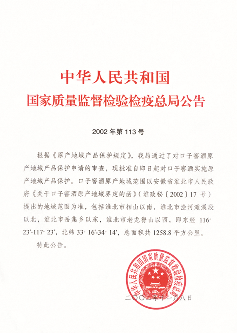 口子窖被國家批準(zhǔn)實施原產(chǎn)地域保護(hù)。