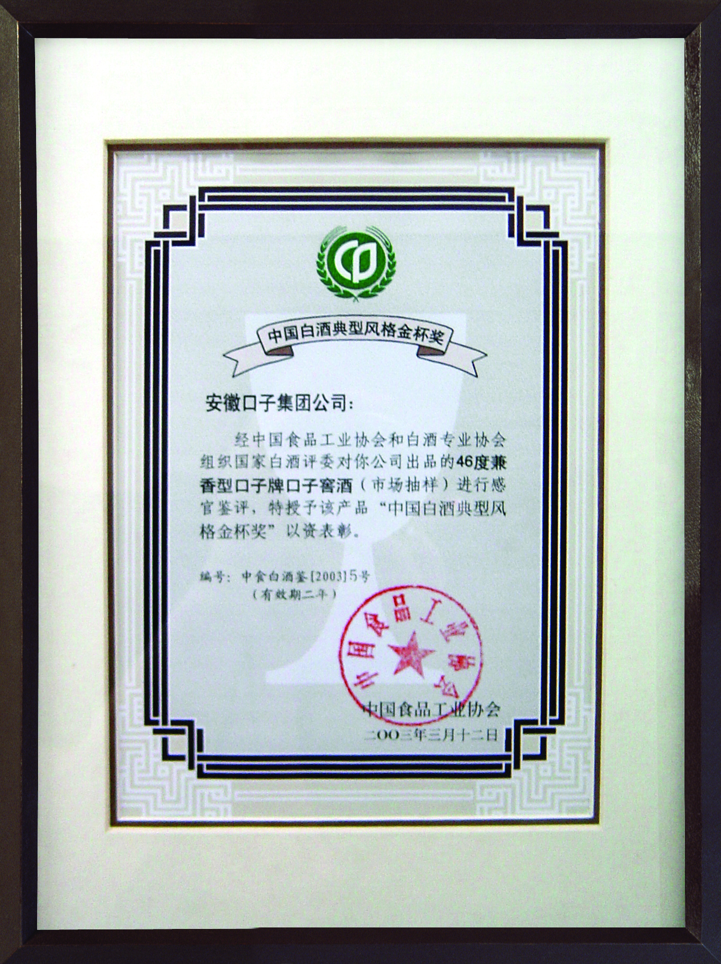 《原產(chǎn)地域產(chǎn)品·口子窖酒》(GB19328-2003)通過中國白酒標(biāo)準(zhǔn)化委員會認(rèn)定,“兼香型”為中國白酒極富意義的又一大香型,并正式確定了口子窖酒國家標(biāo)準(zhǔn)。
