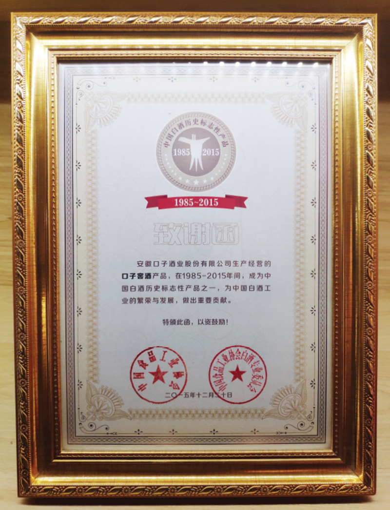 口子窖酒被中國食品工業(yè)協(xié)會授予“1985-2015中國白酒歷史標(biāo)志性產(chǎn)品”稱號。